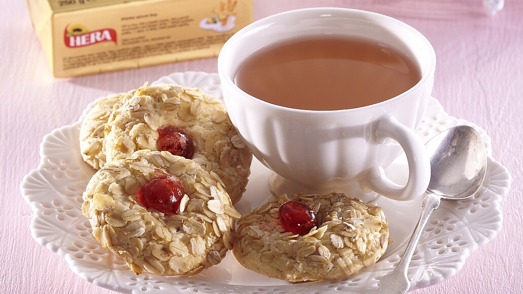 - Placičky potřeme bílkem a obalíme v ovesných vločkách. Rozložíme je na plechy vyložené pečicím papírem a obráceným koncem vařečky uděláme do středu důlek. Do důlku vmáčkneme půlku kandované třešně.