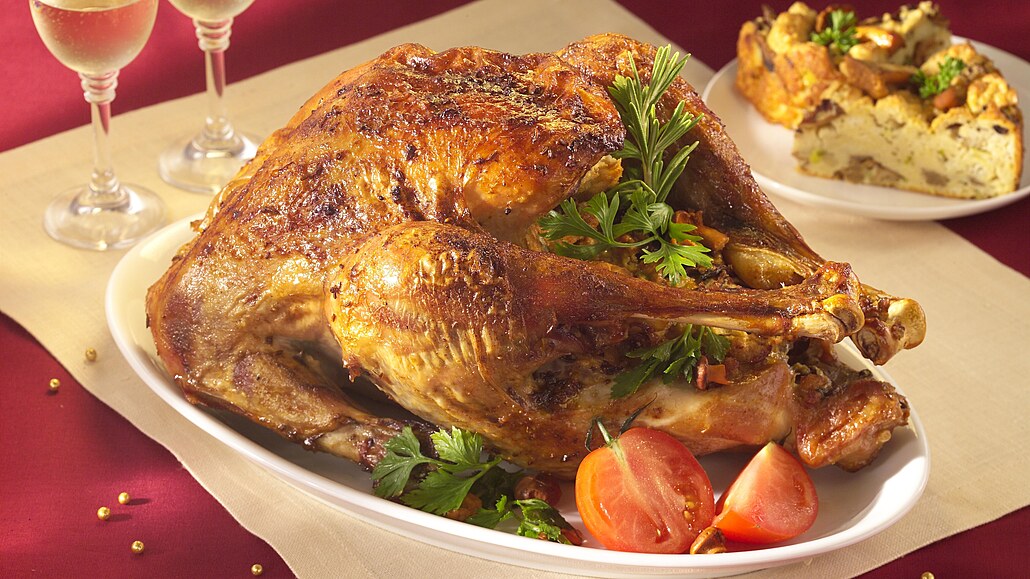 - Pekáč vložíme do trouby a pečeme zvolna při 165 °C přibližně 3 hodiny, dokud není maso měkké a kůrčička zlatavá. Během pečení podléváme krůtu horkou vodou a maso stále poléváme vypečenou šťávou. Je-li krůta větší, musíme počítat s delším pečením. Pokud nám zbude nádivka, upečeme ji zvlášť v máslem vymazaném pekáčku.