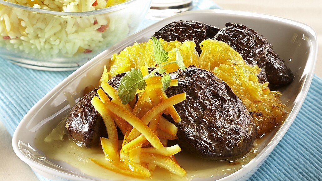 - Játra a pomeranče přelijeme omáčkou a podáváme posypané strouhanou pomerančovou kůrou.