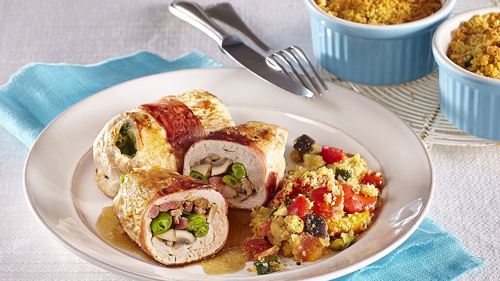 - Slaninu opečeme na suché rozehřáté pánvi. Přidáme žampiony a společně orestujeme. Pak vmícháme fazolky a ochutíme solí a pepřem. Směs necháme zchladnout. Na plátky rozdělíme náplň, přehneme je a zabalíme. Kapsy obtočíme plátkem sušené šunky a zpevníme párátkem.