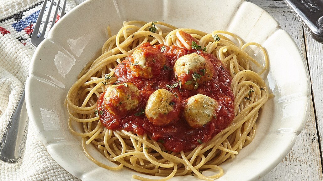 - Masové kuličky vložíme do omáčky a společně vaříme ještě cca 5 minut. Na talíře rozdělíme špagety, přelijeme omáčkou s masovými kuličkami, dozdobíme tymiánem a ihned podáváme.