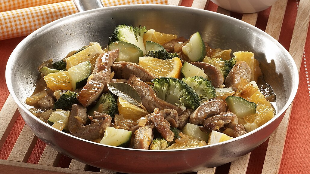 - Když jsou krůtí nudličky měkké, přisypeme do pánve brokolici, cuketu a kousky pomeranče. Vše společně prohřejeme a odstavíme. Podáváme s rýží.