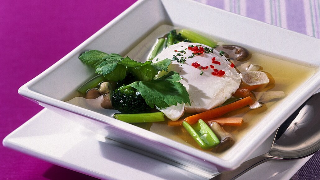 - Do krůtího vývaru dáme vařit nejdříve houby a po 10 minutách přidáme zeleninu a maso. Společně vaříme dalších 5 minut. Polévku dochutíme solí, bílým pepřem a střikem chilli omáčky. Každému vložíme do talíře ztracené vejce a zalijeme horkou polévkou. Ozdobíme petrželkou a nasekanou chilli papričkou.