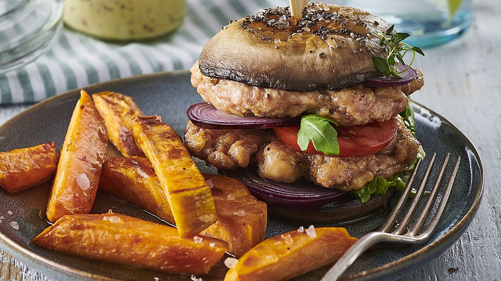- Na 4 kusy portobella přidáme vždy dvě masové placičky, rajče, salátek, rukolu, cibuli, přiklopíme druhým portobellem, spojíme špejlí a posypeme chia semínky. Podáváme spolu s batátovými hranolkami.