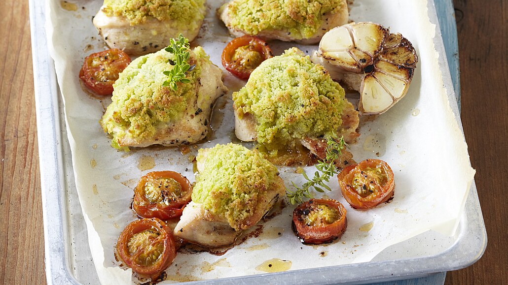 - Krůtí prsa očistíme, nakrájíme na plátky a lehce naklepeme přes mikrotenovou fólii. Osolíme je, opepříme a posypeme tymiánem. Na pánvi rozpálíme olej a plátky po obou stranách opečeme. Pak je přendáme na plech vyložený pečicím papírem.