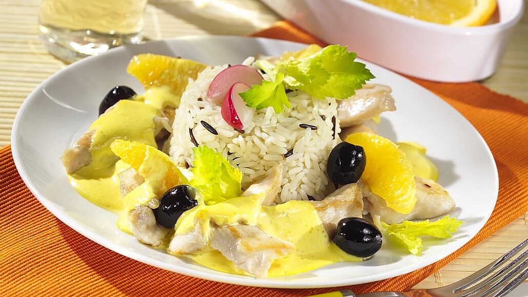 - Do omáčky nakonec vmícháme dílky pomerančů a olivy, dochutíme solí a pepřem a ještě krátce povaříme. Podáváme s různě upravenou rýží.