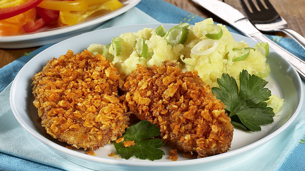 - Krůtí řízky postupně obalíme v mouce, vejcích a rozdrcených paprikových chipsech. Na rozehřátém oleji na pánvi je pozvolna opečeme z obou stran dozlatova. Podáváme se šťouchanými brambory.