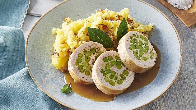 - Vejce rozklepneme do misky, osolíme a prošleháme. Cibuli nakrájíme najemno a opečeme na másle. Do pánvičky vlijeme vejce a umícháme je na konzistenci řidší smaženice. Přidáme hrášek a směs rozprostřeme na připravený plát masa, zarolujeme a pečlivě omotáme provázkem.
