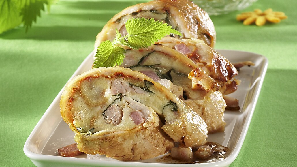 - Na nádivku nakrájíme rohlíky na kostičky, nasypeme je do mísy a zvlhčíme mlékem. Vepřové a uzené maso omyjeme, v mírně osolené vodě vaříme asi 30 minut doměkka. Scedíme, necháme vychladnout a nakrájíme na malé kousky. Kopřivy opláchneme, spaříme a nasekáme nahrubo. Maso, kopřivy a vejce přidáme do mísy k rohlíkům, podle chuti přisolíme, opepříme a okořeníme muškátem. Vše dobře promícháme.