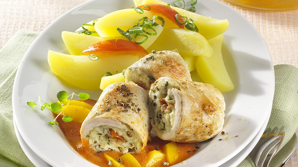 - Na plátky rozdělíme směs, dobře je zavineme, aby náplň nevytékala, a upevníme párátkem. Roládky opečeme na rozpáleném oleji z obou stran.