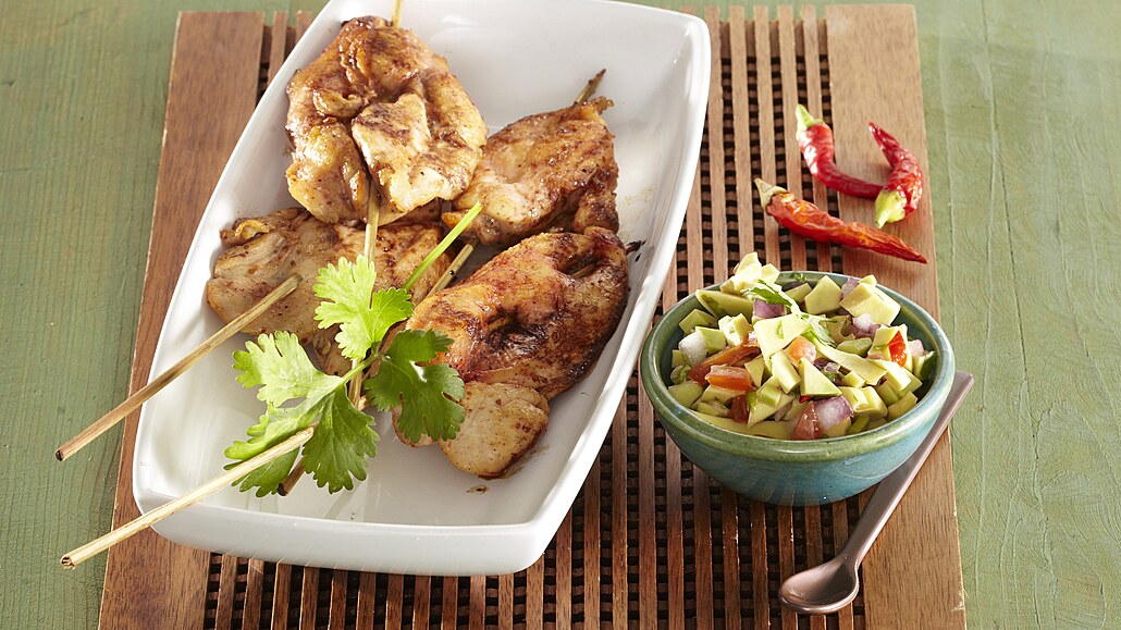 - Maso vyjmeme z marinády, nakrájíme na plátky a napícháme je na špejle. Špízy opečeme v pánvi ze všech stran a rozdělíme je na talíře. Podáváme se salsou a ozdobíme čerstvým koriandrem.