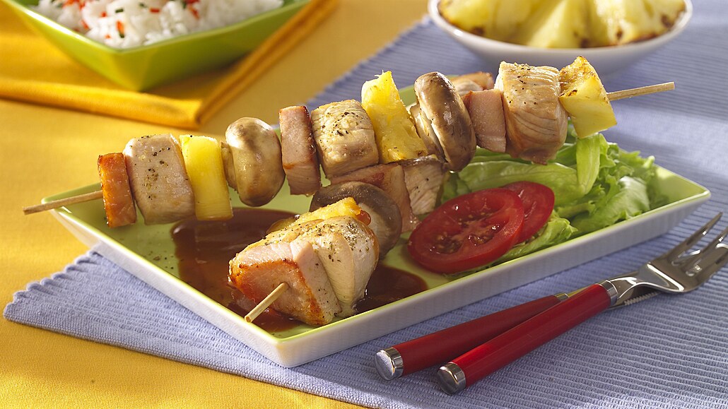- Olivový olej smícháme s kari kořením, bílým pepřem a medem. Na grilovací jehlu nebo špejle napichujeme postupně krůtí maso, šunku, plátek ananasu a žampion. Postupně připravíme všechny špízy.