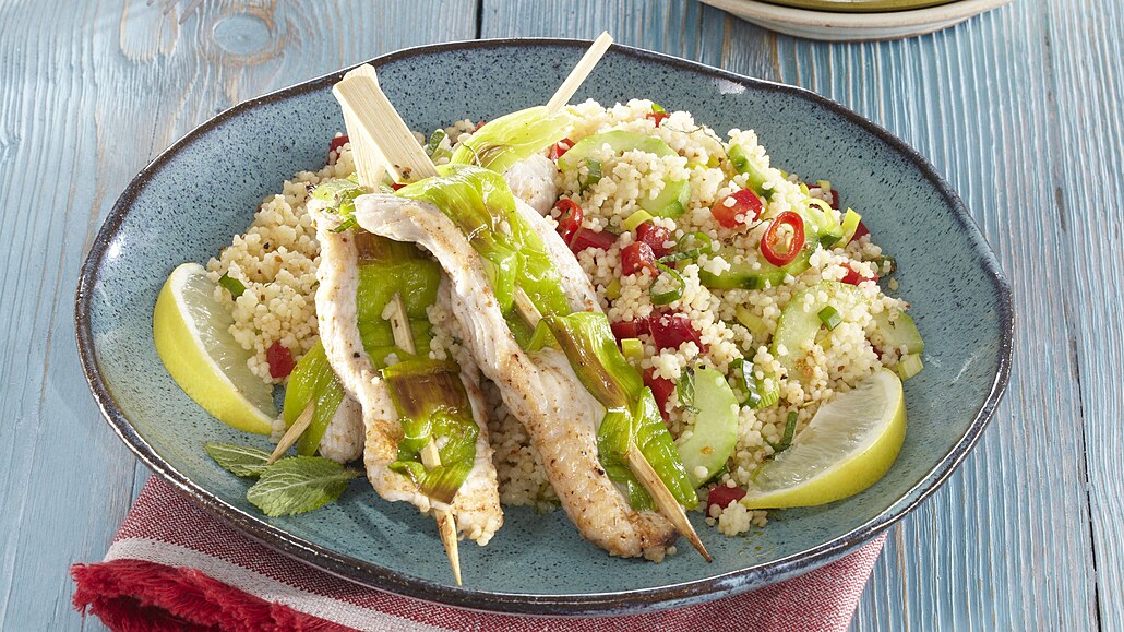 - Jarní cibulku, papriku a chilli papričku nakrájíme na drobné kousky a krátce orestujeme na oleji. Vše promícháme s kuskusem a přidáme nakrájené plátky okurky a nasekanou mátu. Dochutíme solí, pepřem a citrónovou šťávou.