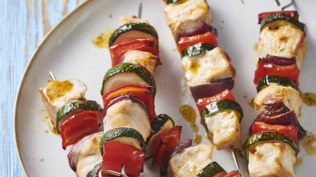 - Na grilovací jehly napichujeme střídavě maso a všechny druhy zeleniny. Grilujeme dozlatova ze všech stran, buď na rozpáleném venkovním grilu, nebo ve vyhřáté troubě při 210 °C na program gril asi 20 minut.