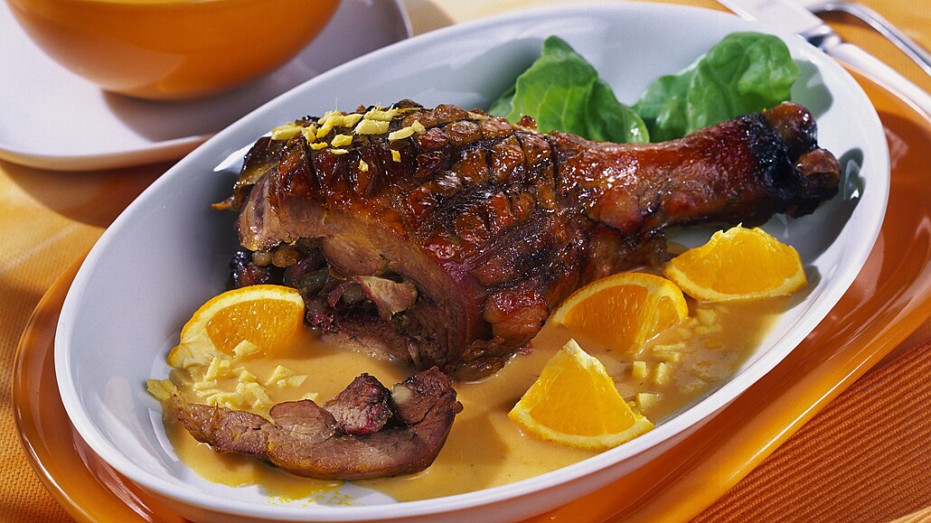 - Pečená stehna podáváme s portskou omáčkou ozdobená kousky pomeranče.