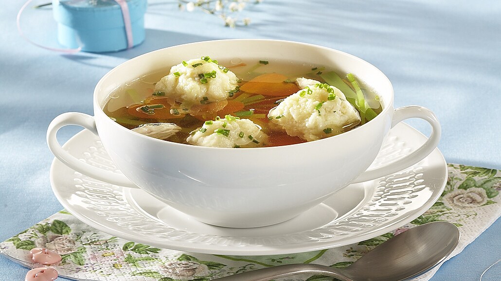 - Do vroucího vývaru vhodíme zeleninu a necháme ji vařit. Když změkne, přidáme do polévky maso, knedlíčky a nasekanou petrželku nebo pažitku. Vše společně prohřejeme. Polévku dochutíme solí a muškátem.