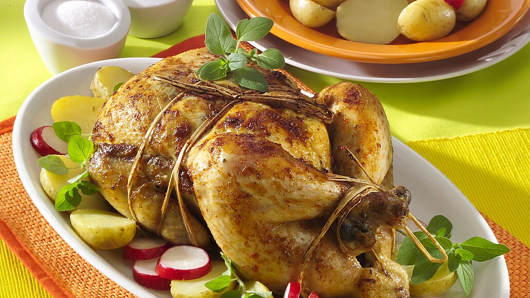 - Upečené kuře přendáme na servírovací mísu, obložíme pečenými bramborami a ředkvičkami, ozdobíme čerstvou dobromyslí, přelijeme vypečenou šťávou a podáváme.