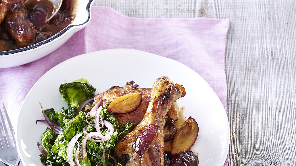 - Mezitím omyjeme švestky. Rozpůlíme je, odstraníme pecky a rozkrájíme na čtvrtky. Když je maso téměř měkké, přidáme ovoce a společně dopékáme (cca 10 minut). Kuřecí stehna se švestkami rozdělíme na talíře, přelijeme výpekem a podáváme s dušenou kapustou.