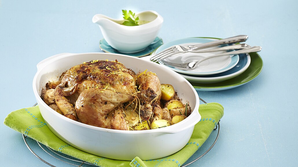 - Brambory omyjeme, přepůlíme a dáme do mísy. Osolíme je a promícháme s nasekaným rozmarýnem. Přidáme je ke kuřeti a pečeme dalších 60 minut.