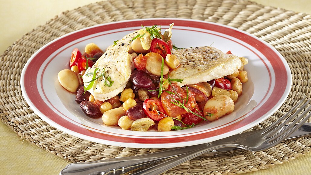 - V kastrolu rozehřejeme zbylý olej a kuřecí řízky po obou stranách pomalu opečeme. Opečené maso vyjmeme. Do výpeku dáme pórek, orestujeme, vyjmeme a přidáme ke kuřecím řízkům. Do kastrolu přidáme luštěniny i s vodou a zlehka pod poklicí vaříme asi 40 minut.
