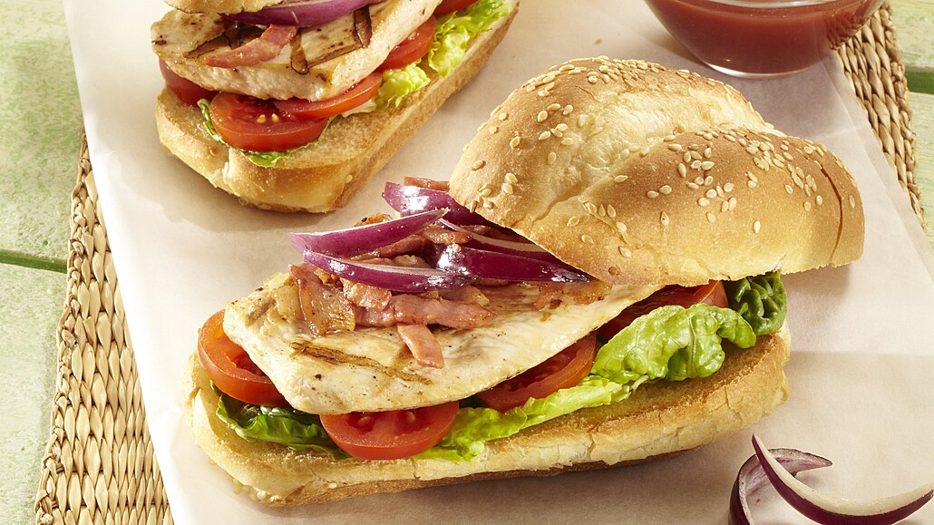 - Kuřecí steaky ogrilujeme. Každou žemli naplníme listem salátu, několika plátky rajčete a steakem. Přidáme trochu cibule a popř. zbylé marinády.