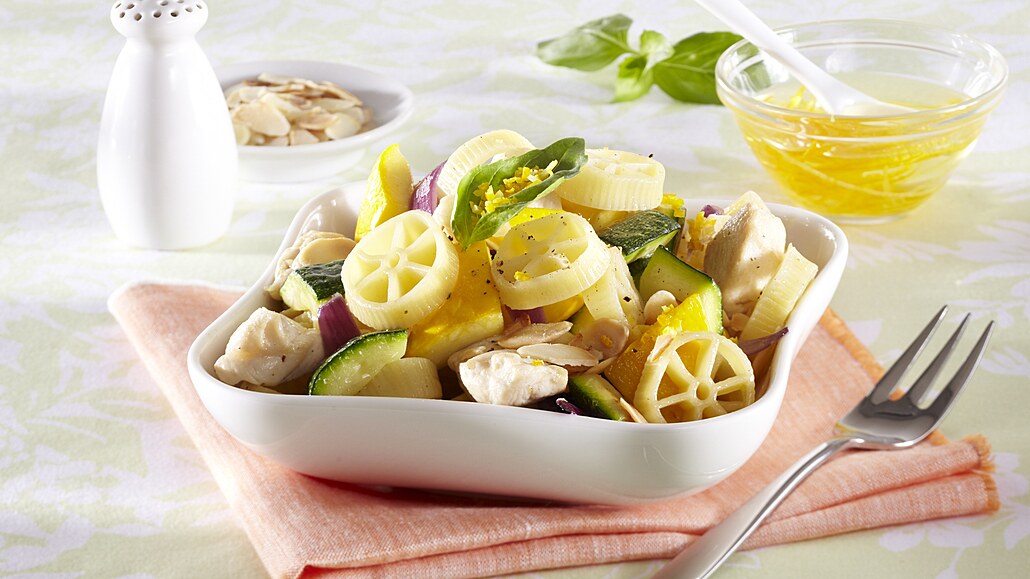 - Přidáme cuketu, česnek a cibuli a orestujeme. Nakonec vložíme uvařené těstoviny, dochutíme solí a pepřem a už jen prohřejeme. Hotové těstoviny posypeme opraženými mandlemi a ozdobíme bazalkou a najemno nastrouhanou citronovou a pomerančovou kůrou.