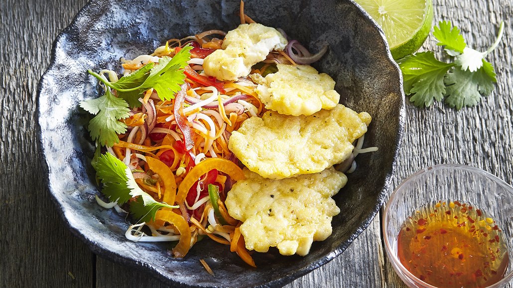 - Mrkev, papriku a cibuli nakrájíme na tenké nudličky. Zeleninu spolu s mungo klíčky a nasekaným koriandrem přendáme do mísy. Vše zalijeme vychladlou omáčkou, promícháme a necháme uležet v lednici. Hotový salát podáváme s placičkami.