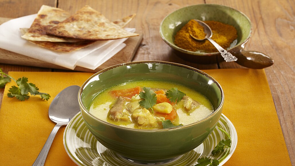 - V rendlíku připravíme z másla a mouky světlou jíšku. Rozředíme ji 300 ml vývaru, prošleháme a přilijeme k zelenině. Promícháme, pak přilijeme dalších 500 ml vývaru a smetanu. Zvolna vaříme, dokud zelenina nezměkne. Nakonec v polévce prohřejeme pokrájené maso. Na talířích ji posypeme lístky koriandru.