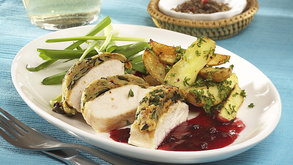 - Vejce rozklepneme a oddělíme žloutky od bílků. Sýr nastrouháme najemno. Chléb nakrájíme na kostičky a dáme do mísy. Přidáme žloutky, sýr, nasekané bylinky a promícháme. Bílky vyšleháme a sníh vmícháme do bylinkové směsi. Směs rovnoměrně rozdělíme na maso. Pečeme v předehřáté troubě při 200 °C asi 15-20 minut dozlatova.