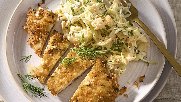 - Řízky smažíme na přepuštěném másle dokřupava z obou stran. Po restování necháme okapat na papírové utěrce a podáváme je se salátem coleslaw.