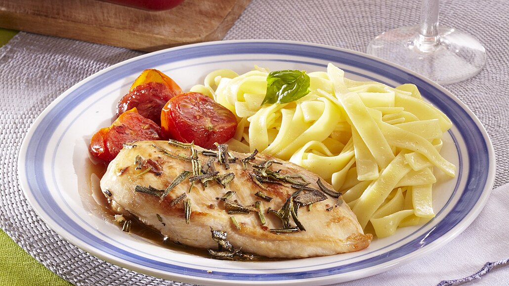 - Kuřecí prsíčka očistíme. Nasolíme je, opepříme a posypeme nadrobno nasekanými lístečky rozmarýnu. V pánvi na oleji je z obou stran opečeme. Pak je přendáme do pekáčku a v troubě je při 160 °C necháme asi 10 minut dojít.