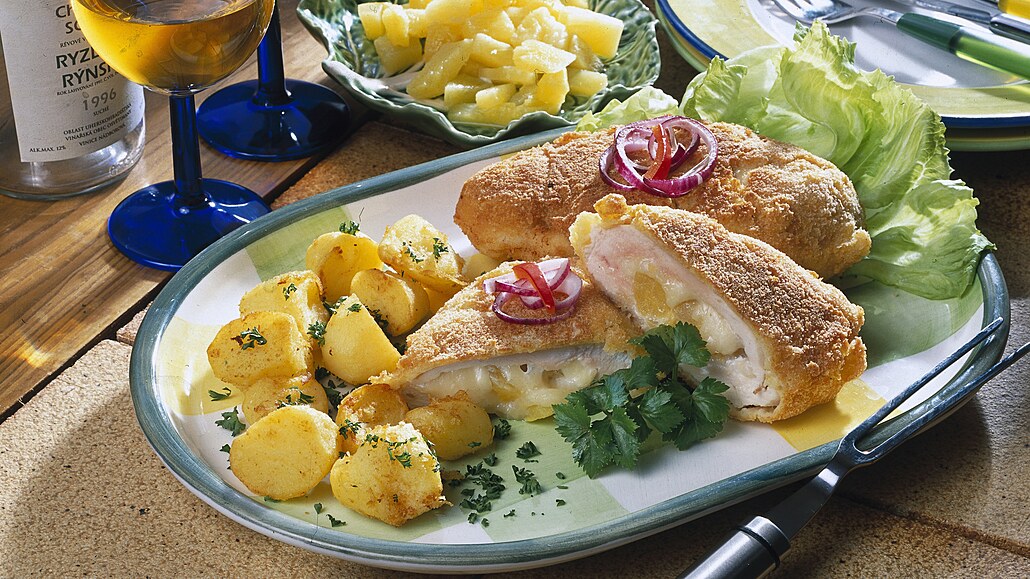 - Plněné smažené řízky podáváme s bramborami, doplníme hlávkovým salátem a zelenou petrželkou.