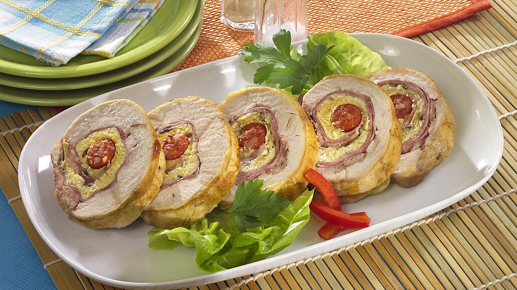 - Připravenou směs rozetřeme rovnoměrně na plát masa. Podél jednoho kraje položíme párky a maso s kůží pevně zarolujeme. Roládu zajistíme kuchyňským provázkem. Pokud je to nutné kůži sešijeme.