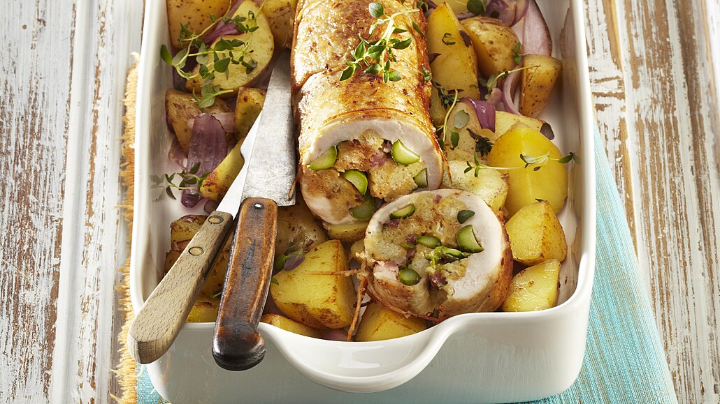 - Kuřecí maso očistíme a rozkrojíme na větší plát. Naklepeme ho, osolíme a opepříme. Chřest omyjeme a zbavíme zdřevnatělých konců. Očištěné výhonky pak překrojíme podélně napůl a poklademe jimi plát masa. Nakonec rozetřeme nádivku a maso zavineme do rolády.