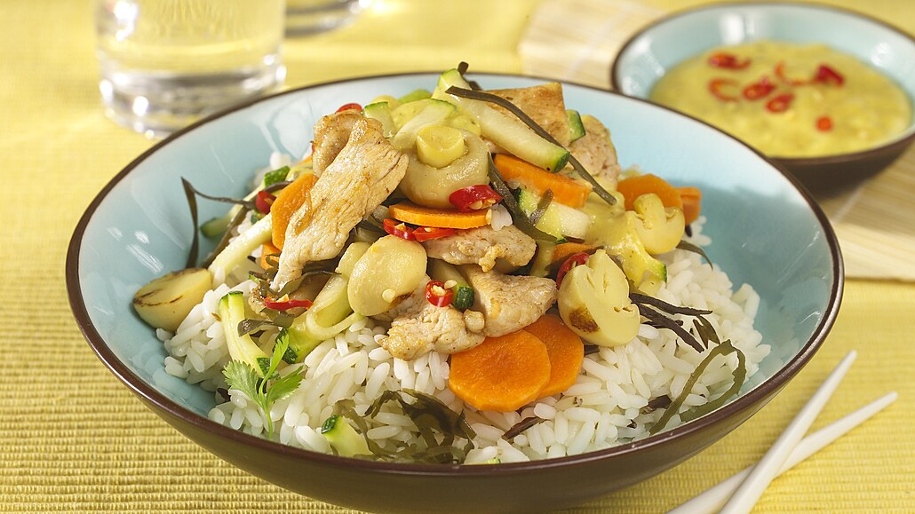 - Orestované maso se zeleninou vyjmeme z pánve, do které vlijeme vývar, víno, sójovou omáčku a hořčici. Vše mícháme do zhoustnutí. Na talířích přelijeme masovou směs hořčičnou omáčkou a podáváme s rýží.