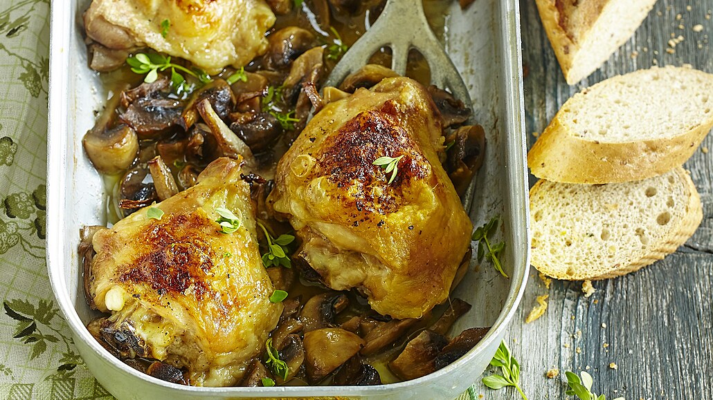 - V pánvi vhodné do trouby rozehřejeme olej a opečeme v něm maso nejprve kůží dolů. Po 5 minutách maso otočíme a opékáme další 2 minuty. Pak maso i s výpekem a nakrájenými žampiony přendáme do pekáčku. Kuře poklademe máslem, podlijeme 100 ml vody nebo vína. Pečeme v předehřáté troubě při 190 °C asi 30 minut. Podáváme posypané čerstvým tymiánem s rozpečenou bagetou.