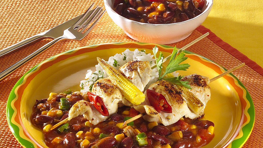 - Proužky kuřecího masa napícháme s kukuřičkami a kousky červené chilli papričky na navlhčené dřevěné špejle. Špízy nejprve ze všech stran opečeme na rozehřátém oleji na pánvi. Poté je přendáme do pekáčku a v troubě při 170 °C necháme asi 10 minut dojít.