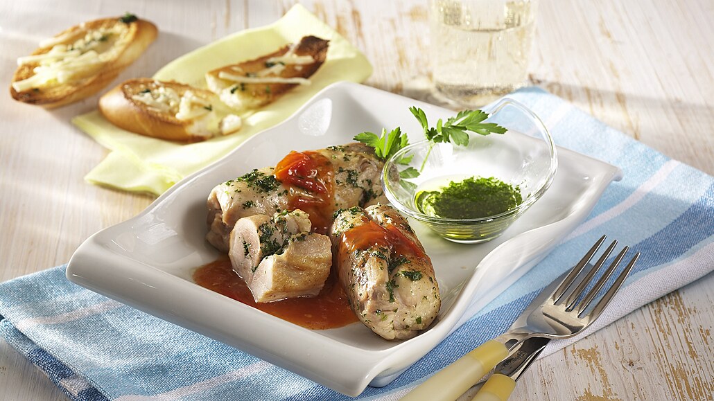 - Plátky masa osolíme, opepříme a potřeme bazalkovým pestem. Maso stočíme do závitku a upevníme párátkem.