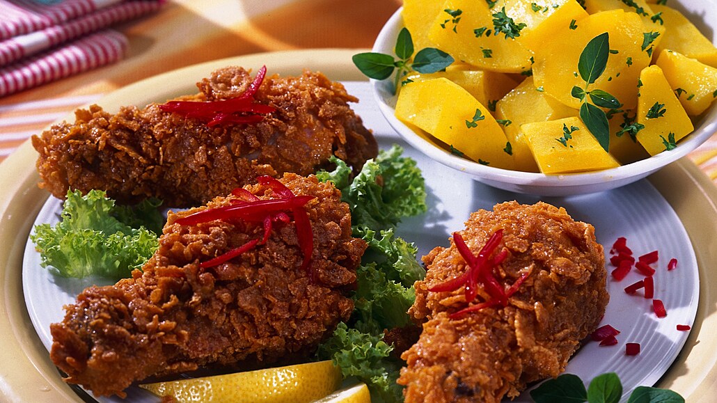 - Připravená stehna nejprve obalujeme v rozšlehaném vajíčku s kořením a potom v rozdrcených kukuřičných lupínkách se sýrem. Lupínky můžeme lehce přimáčknout rukou, aby obal držel.