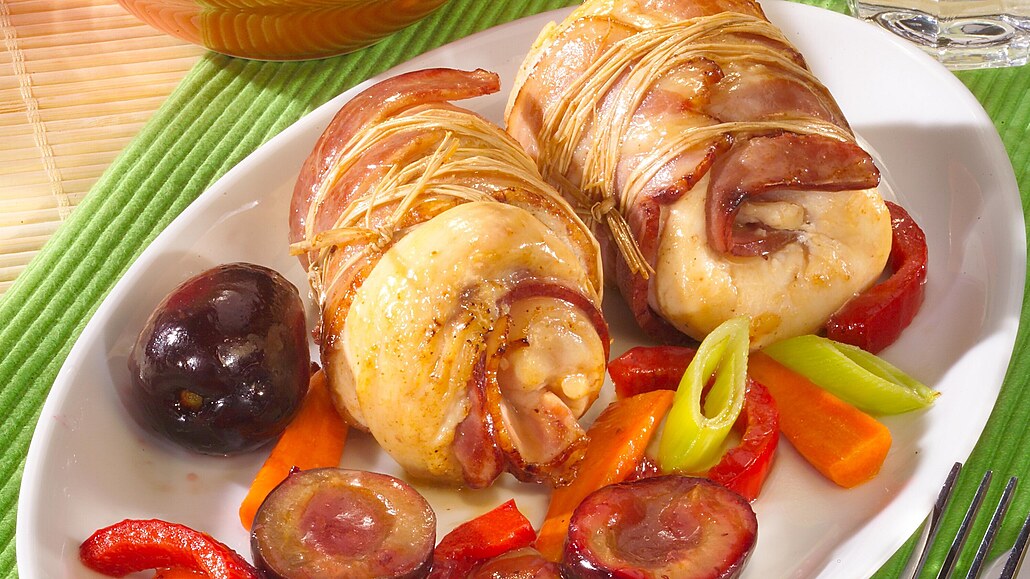 - Do kastrolu, ve kterém jsme opékali maso, přidáme lžíci masla. Švestky a zeleninu vložíme na rozpálené máslo, krátce opečeme, zalijeme červeným vínem, přidáme špetku mletého hřebíčku a skořice. Podle chuti přisolíme, opepříme, případně i trochu osladíme. Vložíme závitky, přilijeme 50 ml vývaru a přikryjeme pokličkou. Dusíme v troubě při 190°C asi 30 minut. Podle potřeby podléváme zbytkem vývaru.