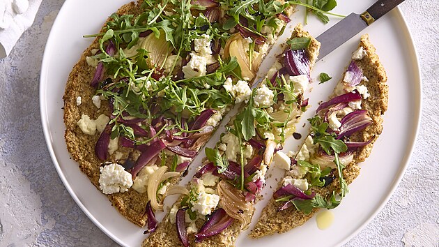 - Na předpečené květákové korpusy rozdělíme cibulovou směs a každou posypeme částí rozdrobeného čerstvého sýra. Pizzy pečeme dalších 15 minut, až budou jejich okraje zlatavé a propečené. Navrch rozdrobíme zbývající sýr, nasypeme rukolu a podáváme.