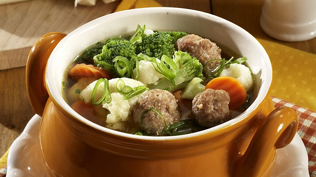 - Naťové cibulky očistíme a nasekáme nadrobno. Do polévky vložíme masové kuličky, posypeme ji cibulkou, podle chuti osolíme a opepříme. Polévku dobře prohřejeme a podáváme.