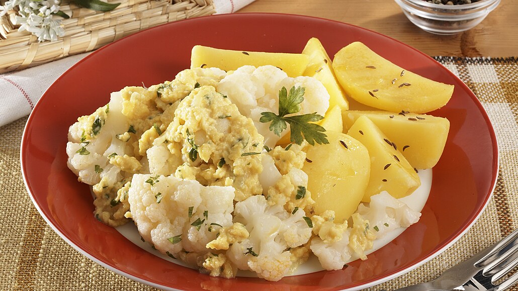 - Zeleninu rozdělíme na talíře. Brambory přelijeme rozpuštěným máslem, na květák naneseme bylinková vajíčka.