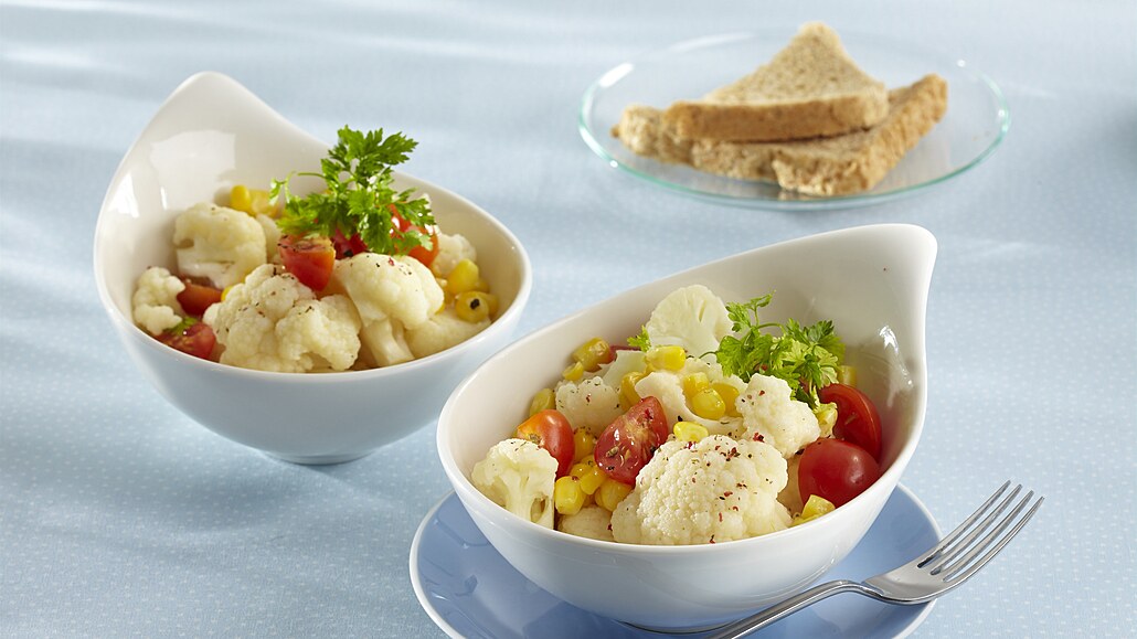 - Květák očistíme a rozebereme na růžičky. V osolené vodě je uvaříme na skus. Pak k němu přisypeme propláchnutou kukuřici a ještě asi minutu povaříme. Zeleninu scedíme a necháme zchladnout. Rajčátka omyjeme a rozčtvrtíme.