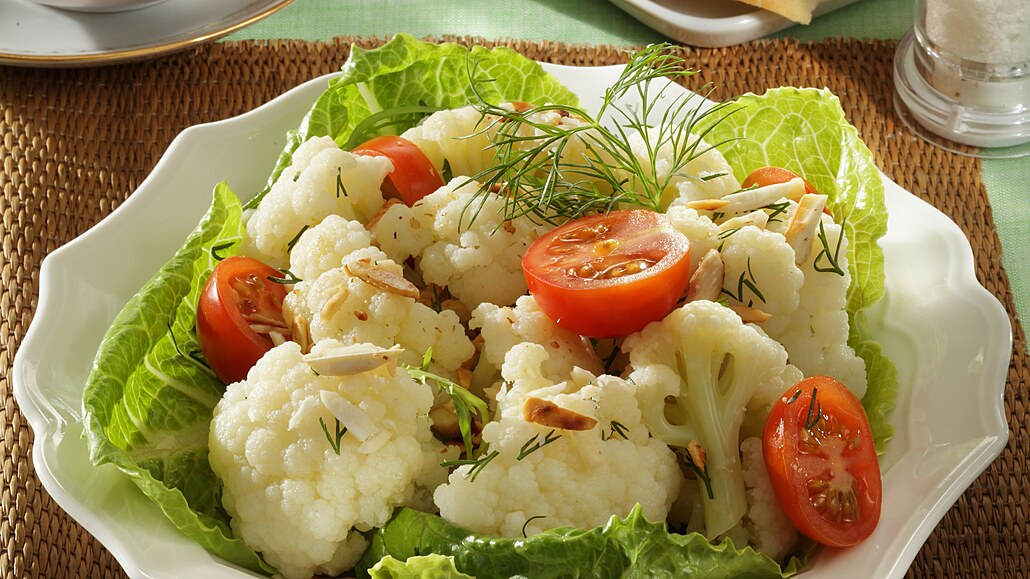 - Na talířky nebo do misek rozdělíme listy salátu. Přidáme květák a rajčátka. Vše posypeme koprem a mandlemi, přelijeme dresinkem a podáváme.