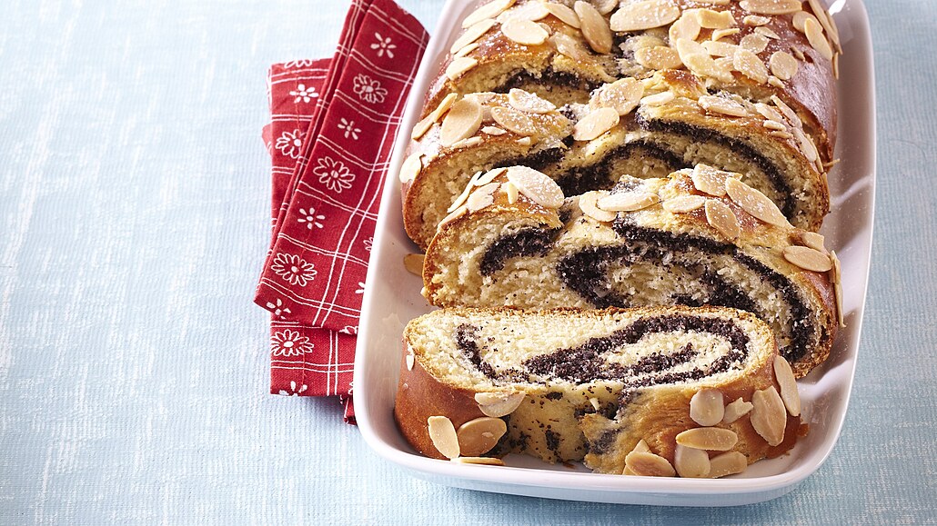 - Roládu položíme na plech a necháme znovu asi 15 minut kynout. Po nakynutí potřeme rozšlehaným vejcem, posypeme mandlovými lupínky a pečeme při 180 °C asi 10 minut. Pak teplotu snížíme a dopékáme dalších 25 minut při 160 °C.