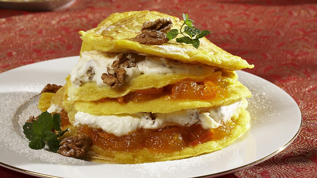- Tvaroh rozmícháme s cukrem a mlékem na hladký krém. Hotové palačinky potřeme nejprve džemem a pak tvarohovým krémem. Navrch nasypeme nasekané vlašské ořechy a trochu moučkového cukru a ozdobíme čerstvou mátou.