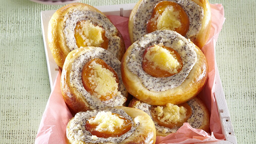 - Tvaroh smícháme s moučkovým i vanilkovým cukrem, citronovou šťávou, vejci a mákem. Meruňky rozpůlíme. Těsto rozkrájíme na 30 kousků, vytvoříme kuličky a rozložíme je na plechy vymazané tukem. Necháme nakynout.