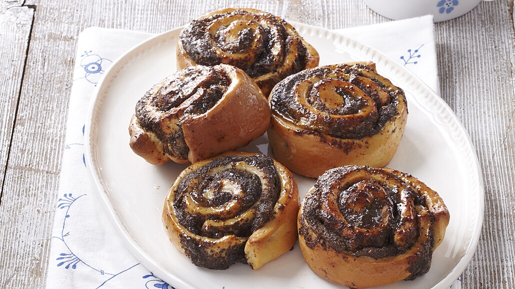 - Těsto rozválíme na pomoučněném vále do tvaru obdélníku a povrch pomažeme povidly. Makovou náplň dle potřeby zahustíme strouhaným perníkem a rozetřeme ji na celý povrch těsta. Stočíme do rolády, kterou nakrájíme na asi 3 cm plátky. Šneky pokládáme na lehce vymazaný plech. Šneky propíchneme napříč špejlí, aby se nám při pečení nerozjely. Pečeme v předehřáté troubě na 165 °C asi 40 až 50 minut. Po upečení potřeme šneky rozpuštěným máslem promíchaným s medem.