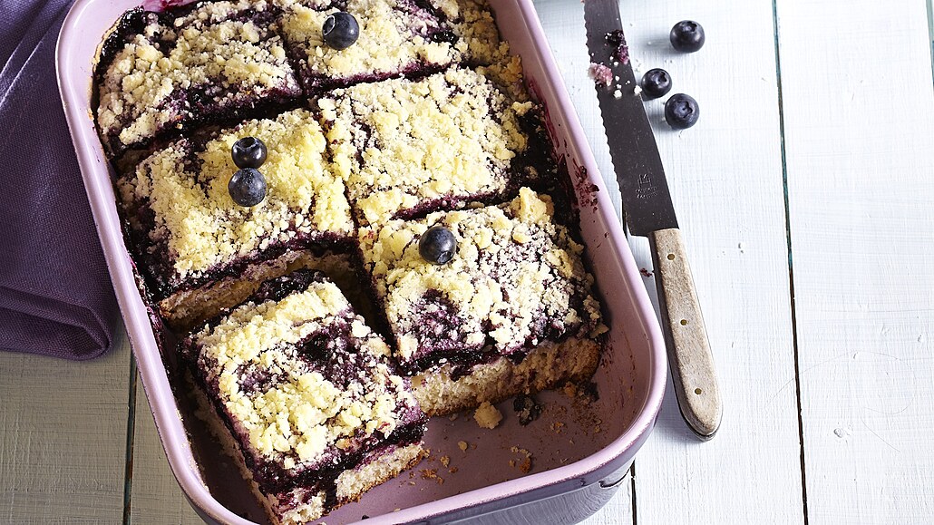 - Těsto potřeme borůvkovou náplní a posypeme drobenkou, připravenou z másla, cukru, skořice a mouky.